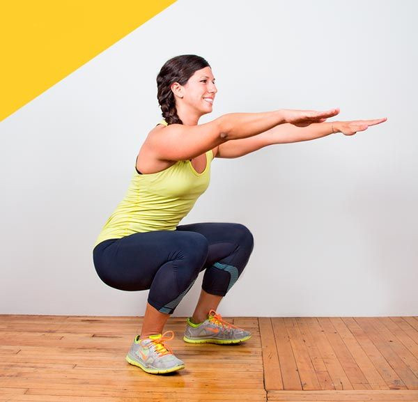 - Чтобы сохранить равновесие, вы можете вытянуть руки вперед при работе в приседе.