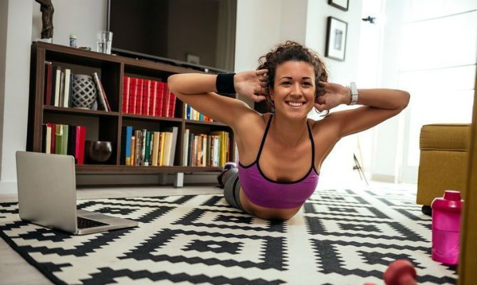 - Лягте на спину, согните колени и положите руки за голову. Начните качать пресс так, чтобы ваши локти касались колен. Положите руки на подставку, например на диван, выпрямите ноги и вытяните назад. Начните делать отжимания, не сгибая тело.