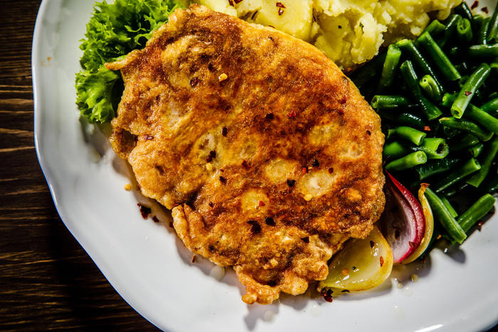 - Овощной салат, порция риса, отбивная и сок.