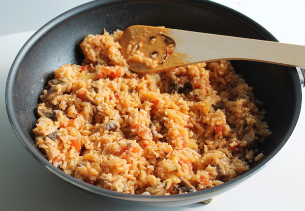 - Добавьте рис к грибам, варите 20 минут. Не добавляйте воду — и рис будет рассыпчатым.