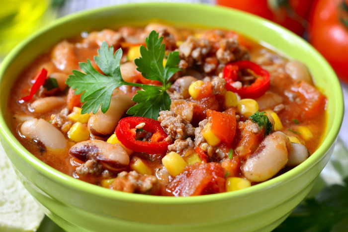 Тушеная фасоль, курица и помидоры
