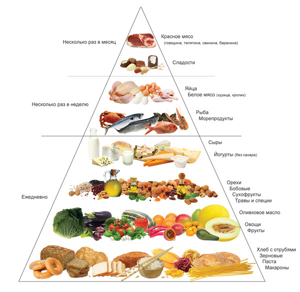 Обычно в средиземноморском регионе первый завтрак состоит из злаков и овощей, второй – из кисломолочных продуктов и фруктов, в обед — макароны, рис, овощные супы, салаты, рыба или мясо – это основной прием пищи за день. На закуски и ужин идут различные овощные запеканки, сыры, фруктовые салаты, морепродукты. Все продукты, упомянутые выше, составляют так называемую пирамиду средиземноморской диеты.