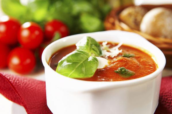 - Ужин: томатный суп с ломтиками жареного хлеба и зеленью.
