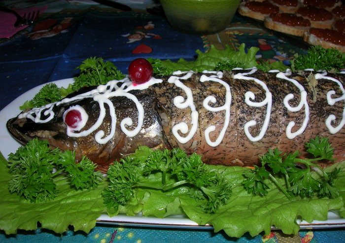 - Теперь готовой начинкой фаршируем рыбу, кладем её на противень. Выпекаем около часа. Готовую рыбу кладем на большое блюдо, кладем вокруг нарезанные овощи и подаем к столу.