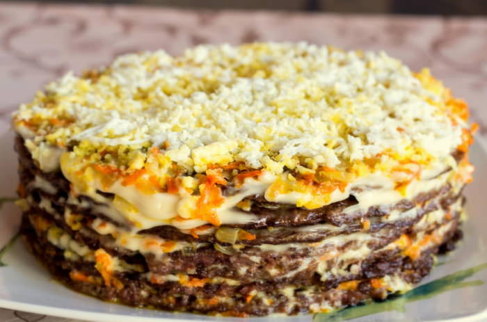 - Как только все блины будут готовы, их начинают выкладывать в стопку, промазывая при этом каждый блин начинкой, причем промазывая обильно, чтобы пирог не был сухим.