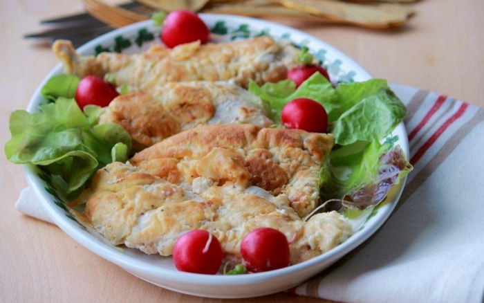 - Приготовленные куриные стейки обжариваем, но перед этим обваливаем их в каждой из трех мисок.