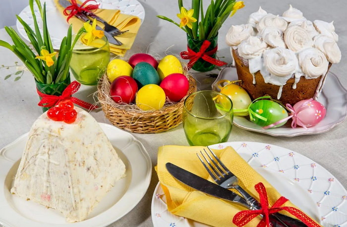Было принято ставить на стол в Светлое Воскресенье 48 блюд – по количеству дней поста. Тогда праздник гуляли всей большой семьей или даже деревней, и каждая хозяйка несла к столу с любовью приготовленную пищу. Обычно это были различные мясные блюда – колбасы, буженина, овощные блюда, куриные тушеные потроха, сельдь и блюда из рыбы. Готовили все это в чистый четверг или в субботу накануне праздника.Застилать стол на Пасху нужно праздничной белой скатертью с нарядным вышитым орнаментом, а для сервировки выбирать самые красивые блюда и столовые приборы.