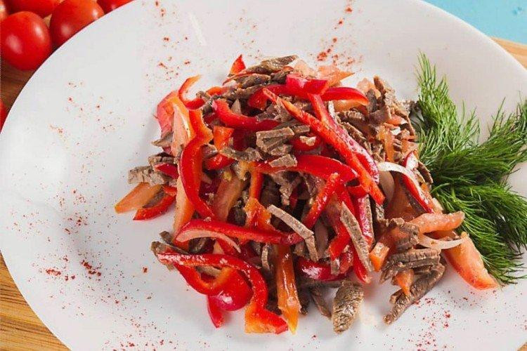 Мясо отварить в воде с 1 луковицей, специями и лавровым листом по вкусу, затем дать остыть в бульоне. Смешайте маринад, состоящий из воды, масла, сахара, лимонного сока, бальзамика, соли и специй. Мясо нарезать кружочками, лук – полукольцами, перец – кубиками, залить маринадом, перемешать и поставить на ночь в холодильник. Перед подачей посыпать зеленью.