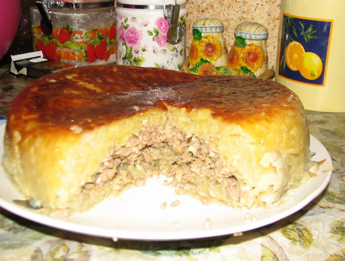- Делаем 2-3 прокола ножом, отправляем в разогретую до 160-170 градусов духовку на 45-50 минут. Готовый пирог выкладываем на разделочную доску, смазываем верх сливочным маслом и укрываем полотенцем, оставляем «настояться» на 15-20 минут.
