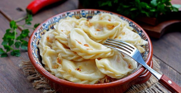 - Варить их нужно примерно 5-7 минут в соленой воде. Пока готовятся вареники, оставшийся жареный лук выложить в глубокую миску, добавив кусочки сливочного масла. Готовые вареники вынуть шумовкой из кастрюли и отправить в тарелку с маслом и луком, перемешать.