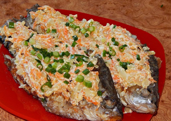 - Перед подачей на каждую тушку кладем обжаренные овощи со сметаной. Они придадут рыбе приятный аромат и нежный вкус.