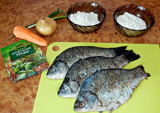 Теперь обсудим основные кулинарные тонкости приготовления карася. Мелкую рыбу смело можно жарить целиком, а вот крупные тушки сначала разрезают на кусочки.При необходимости заранее разморозьте карася. Но учтите, что свежая рыба намного вкуснее и ароматнее. С него чешуйки удаляются с помощью специальной щетки. Далее удаляется голова, плавники и хвост.