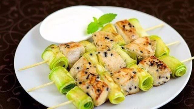 Курицу, цуккини, лук нарезать кусочками. Добавить масло, душицу, уксус, соль и перец. Перемешать, мариновать 1 ч. Поочередно нанизать на шпажки. Жарить на решетке гриль до готовности. Из сыра, мяты и йогурта приготовить соус, смешав ингредиенты. Шашлычки выложить на блюдо, затем полить соусом.