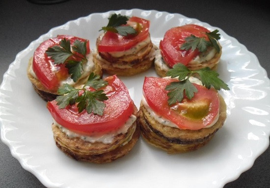 - Сверху выложить еще один кружок обжаренных кабачков.