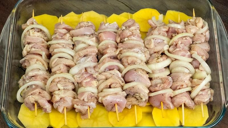 - На картошку кладем шпажки с нанизанными кусками свинины и отправляем форму запекаться в духовку, разогретую до 200 градусов.