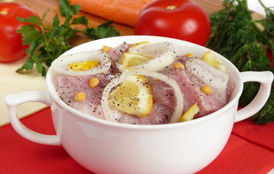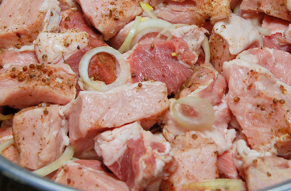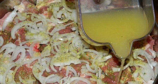 - Мясо, предварительно нарезав его на кусочки нужного размера, хорошо смазать сметаной, а затем смешать с луком, положить в миску или кастрюлю и залить маринадом.