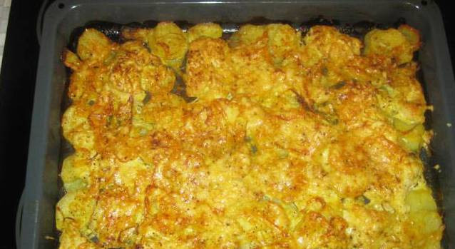 - Маринад, оставшийся от мяса, перемешиваем с тертым сыром. Поливаем приготовленной жидкостью продукты в форме. Запекаем при 180 градусах около 40 минут. Проверяем готовность при помощи вилочки, картофель должен стать мягким.