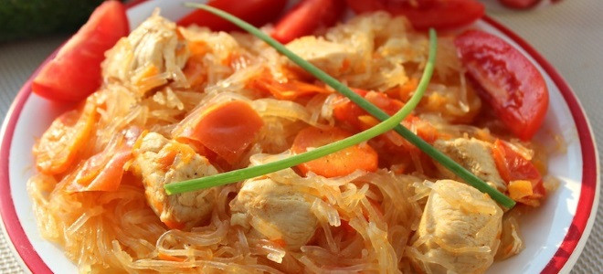 Фунчоза, рецепт приготовления с курицей и овощами которой будет изложен следующим, готовится с добавлением помидоров, которые придадут закуске дополнительную сочность и освежат и без того великолепный ее вкус. Овощной состав в данном случае используется в свежем виде, что повышает витаминную ценность яства.- фунчоза – 100 г;