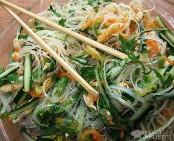 Салат «Фунчоза» с курицей и овощами, рецепт с фото которого я предлагаю, это самый любимый салат для моих родных и всех друзей. Можно конечно же приготовить старые и всем знакомые салаты, но они не вызывают столько эмоций, как необычный салат из стеклянной лапши. Фунчоза действительно выглядит как стёклышко. Она хоть и не имеет выраженный вкус, но зато со специями и соусом получается самая вкусная лапша. Фунчоза придает салату объем и питательность. Курица и овощи с фунчозой очень хорошо гармонируют, поэтому приступайте к приготовлению вкусного салата вместе со мной.- 1 упаковка фунчозы,