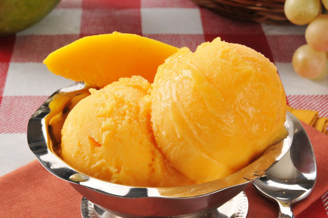 - Превратите 3 спелых манго в пюре, влейте в массу половину стакана минеральной воды, полстакана натурального яблочного сока и сок половины лимона. Замораживайте десерт в течение 4 часов, время от времени перемешивая его для получения воздушной консистенции.
