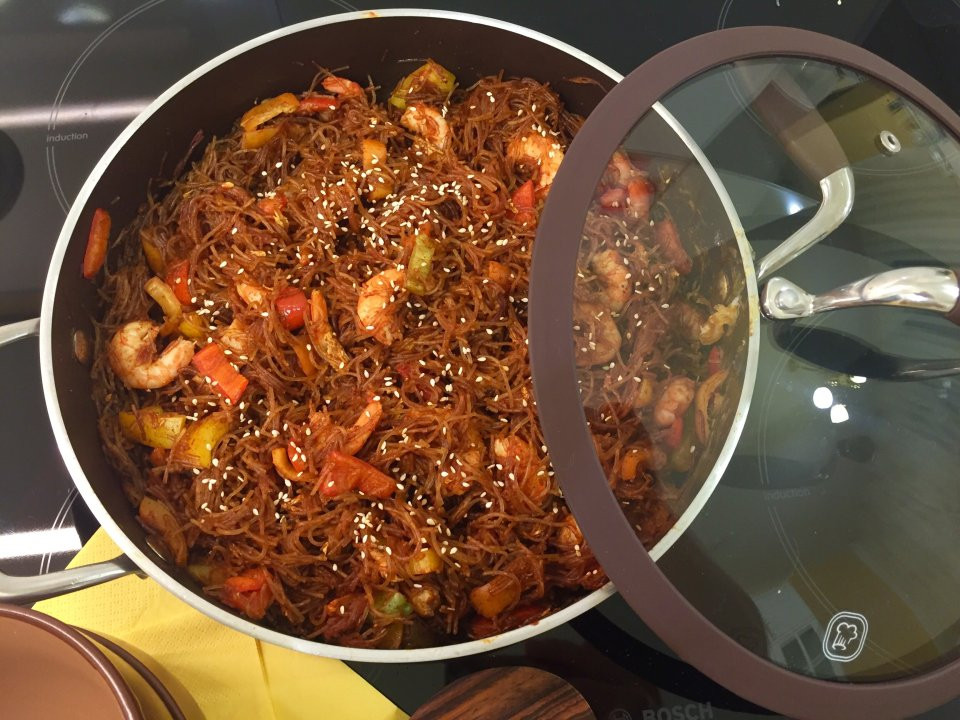 - Далее выкладывается фунчоза в сковороду, туда же добавляются креветки и всё хорошенько перемешивается. Жарится это всё вместе 5 мин. на маленьком огне, постоянно помешивая. Добавляется 5-7 ст. л. соевого соуса и сок лайма. Всё перемешивается и подаётся к столу.