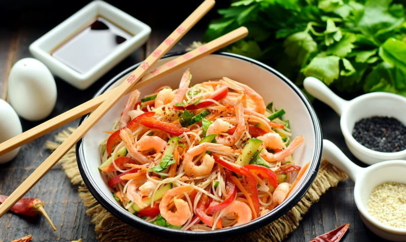 Фунчоза с креветками в соевом соусе — простой рецепт