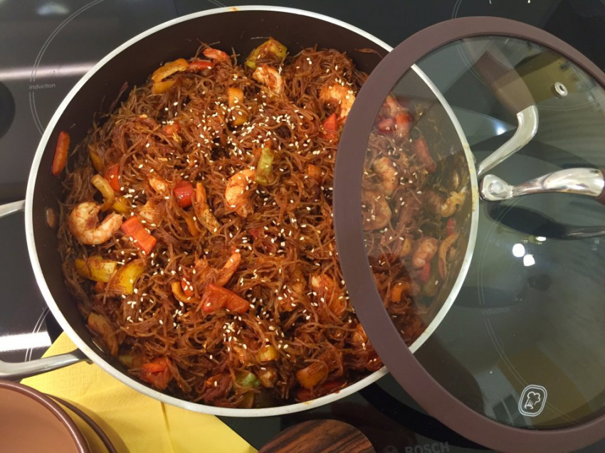 - Доводится смесь до кипения. Как только почувствуется аромат, всыпается сначала фунчоза, а потом, сверху — креветки. Накрывается крышкой и варится на среднем огне, пока соус не закипит. Затем убавляется огонь и варится 3 минуты. Помешивается блюдо так, чтобы креветки оказались внутри и варится на маленьком огне под крышкой еще 2-3 минуты, до готовности креветок и фунчозы.