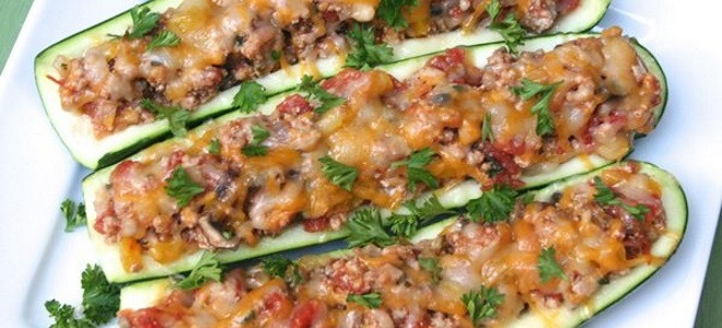 Красиво смотрятся на столе фаршированные кабачки лодочки в духовке. Для их приготовления нужен противень с бортиками или форма для запекания, лучше всего подойдут жаропрочные стеклянные или керамические. Фарш будет сочнее, если смешать сразу несколько сортов: говядину, свинину, телятину.