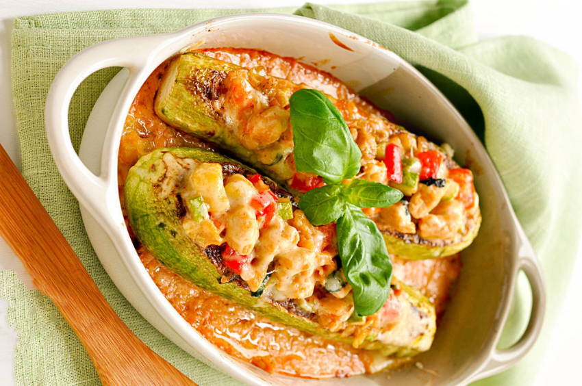 Запечённые кабачки, фаршированные курицей, грибами и сыром