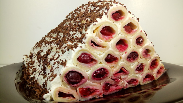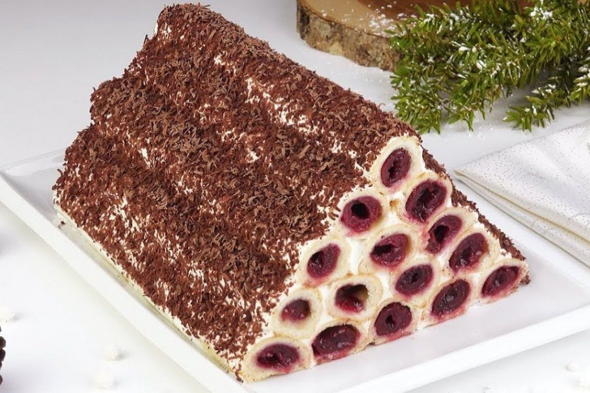 - Когда вишневые трубочки полностью остынут, приступайте к сборке торта. На плоскую форму или блюдо выложите сначала пять трубочек, смажьте их кремом. Затем выложите четыре трубочки и вновь пропитайте кремом – и дальше по принципу пирамиды, чтобы в итоге наверху оказалась одна трубочка.