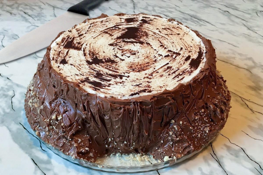 - Полученной глазурью обмазываем торт по бокам. При желании можно вилкой нанести полоски, которые будут имитировать кору пня.