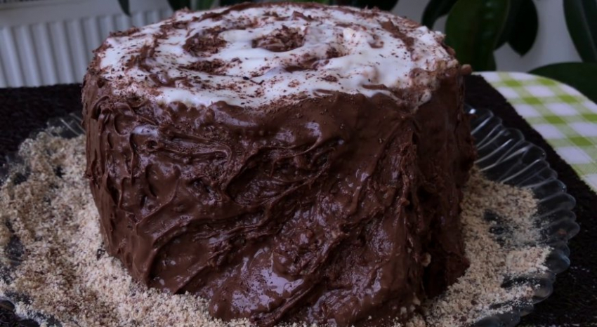 - Торт Трухлявый пень должен настояться в холоде не менее 6 часов (можно больше). Затем вынуть форму из холодильника, аккуратно перевернуть торт на блюдо, смазать бока и поверхность оставшимся кремом.