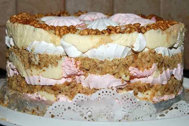 - Возьмите большую плоскую тарелку и выложите на нее половины воздушного лакомства. Когда фундамент будущего торта будет заложен, полейте его взбитыми сливками, присыпьте орехами, затем сверху накройте печеньем и с усилием придавите руками.