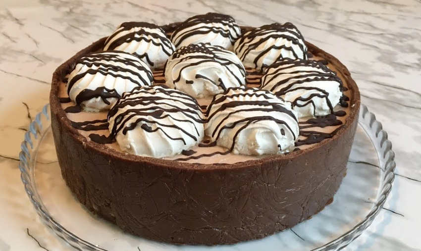 - Середина тортика остаётся нетронутой. Края декорируются отложенными «шляпками» зефира, тертым шоколадом и толчеными орехами.
