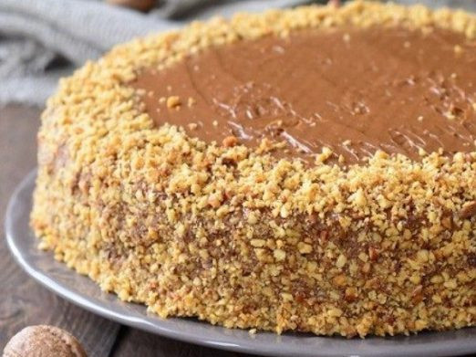 Для этого торта из готовых бисквитных коржей используется арахис. Но можно взять и грецкие орешки. Крем обыкновенный заварной.