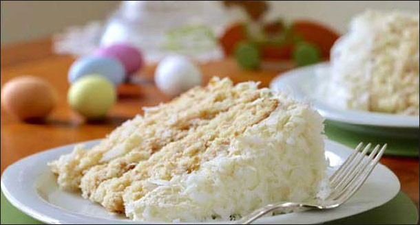 - Последний, верхний корж покрываем оставшимся кремом.Обильно посыпаем кокосовой стружкой