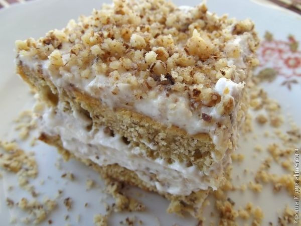 - Промазать коржи кремом, немного присыпать слои орехами.