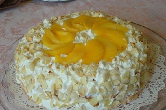 Для этого торта из готовых бисквитных коржей используется нежный творожный крем. Персики можно использовать консервированные либо свежие. Аналогично можно взять абрикосы. На приготовление этого торта уйдет не более 15 минут.