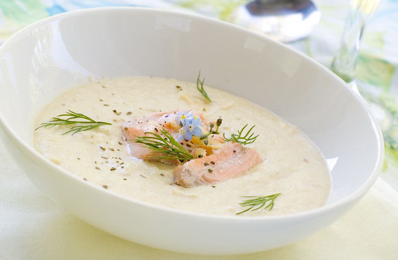 - В каждую миску влейте по половнику (или два) супа-пюре. Тонкой струйкой добавьте немного сливок. Если изловчиться, можно сделать рисунок на поверхности супа. В каждую порцию выложите по 2 кусочка рыбки. Украсьте зеленью и подайте к столу.