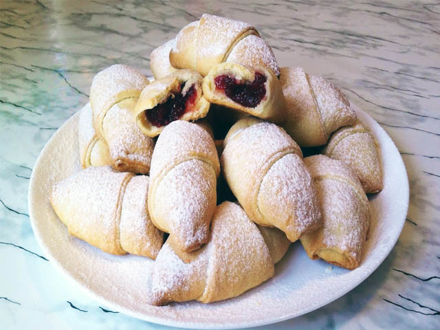 - Выкладываем полученные рогалики на противень, смазанный маслом. Выпекаем в духовке при 180 градусах в течение 20 минут. Горячие сладости сверху посыпаем сахарной пудрой и подаем на стол.