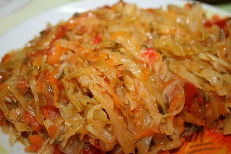 - Капусту шинкуем, как на засолку, морковку трем, лук и болгарский перец нарезаем тонкими полосками. Складываем овощи в большую кастрюлю, вливаем томатный соус, растительное масло. Добавляем лавровый лист, солим и перчим, вливаем воду и ставим тушиться. Держим на медленном огне 1,5 часа с момента закипания. Периодически помешиваем, чтобы овощи не пригорели.