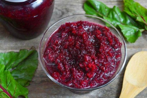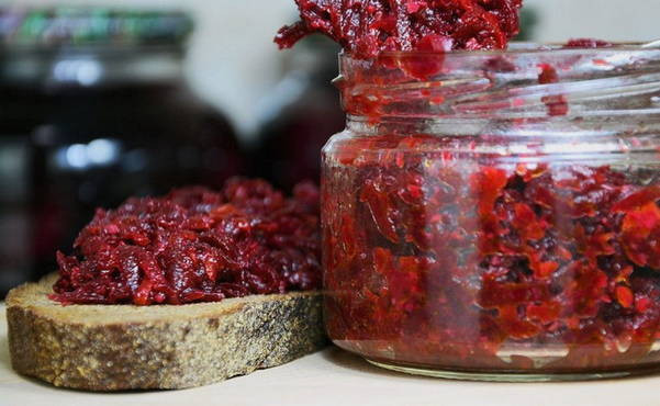- Свекольная масса раскладывается по маленьким стеклянным баночкам, тщательно вымытым с пищевой содой. Закатывается привычным способом.