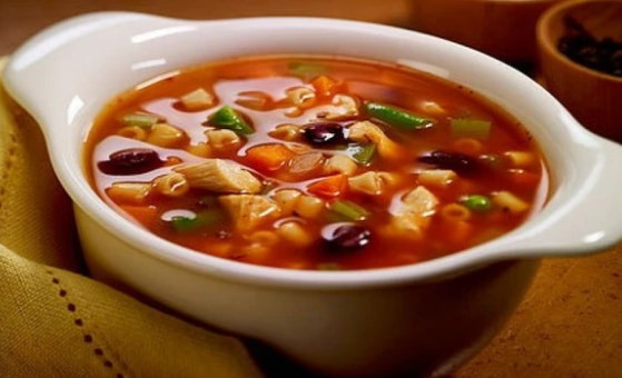- В приготовленный куриный бульон поместите обжаренную колбаску, филе курицы и овощи обжаренные в томатной пасте. Если это потребуется, то добавьте соль. Добавьте лавровые листки поперчите, варите около семи минут. После того, как отключите плиту добавьте оливки и дайте супу настояться под закрытой крышкой.