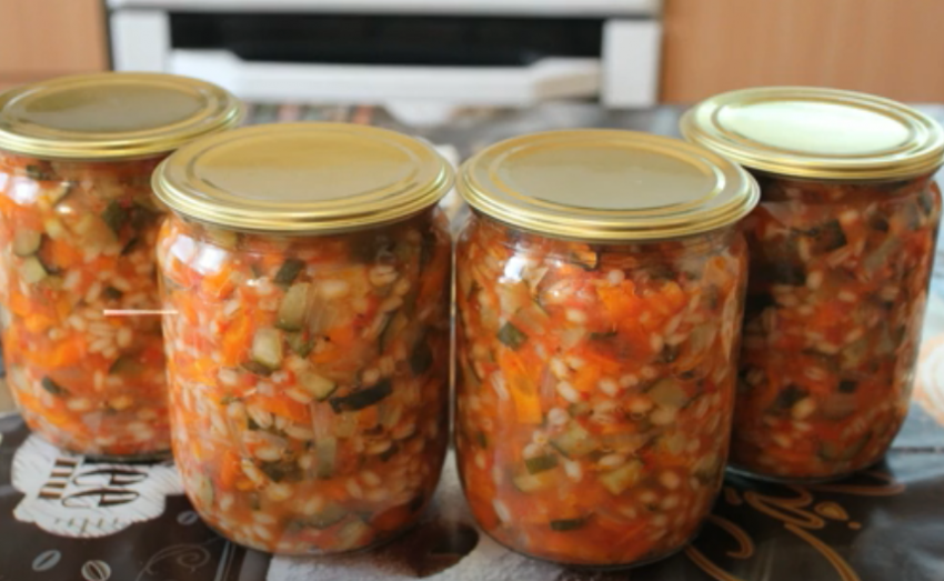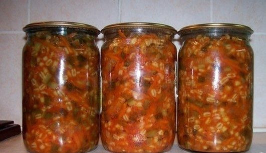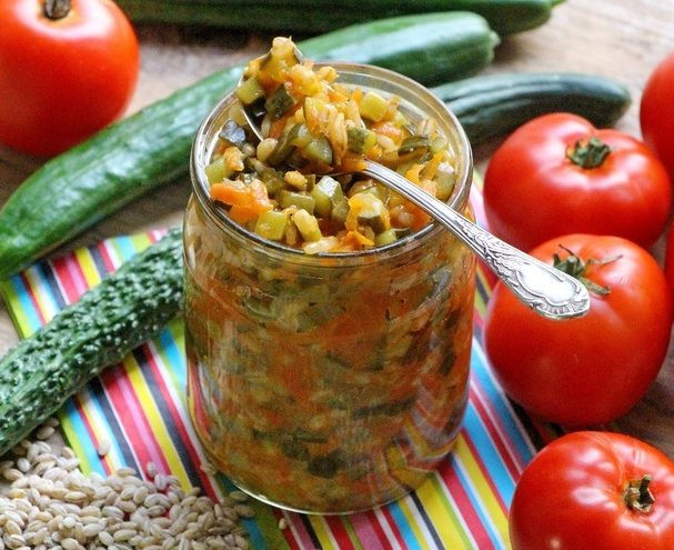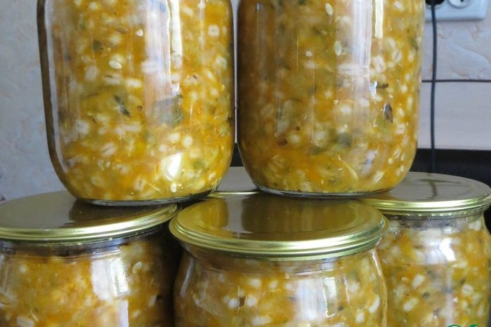 Крупу перловки (200 г) отварить до готовности. Нарезанные небольшими кубиками огурцы (1,5 кг), по полкило лука и морковки, измельчёнными как для супа, сложить в кастрюльку. Туда же влить растительное масло (100 мл).