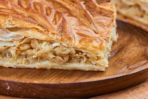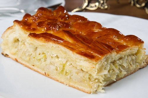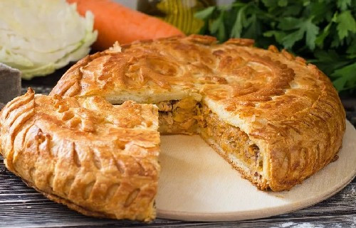 - Подавайте к столу пирог с капустой на слоеном тесте, пока он еще теплый.