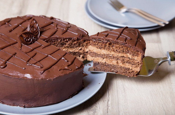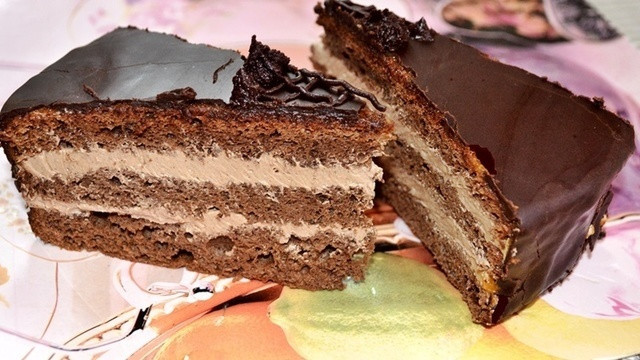 - Остывший бисквит аккуратно разрежьте острым ножом на 3 коржа (также для этой цели можно использовать зубную нитку или специальное приспособление для коржей). Каждый корж густо промажьте кремом. Остатки крема используйте, чтобы обмазать бока торта. Сверху полейте торт шоколадной глазурью и поставьте его часов на 5-6 в холодильник для пропитки коржей и густоты глазури. Вкусный, ароматный, шоколадный торт Прага в мультиварке готов!