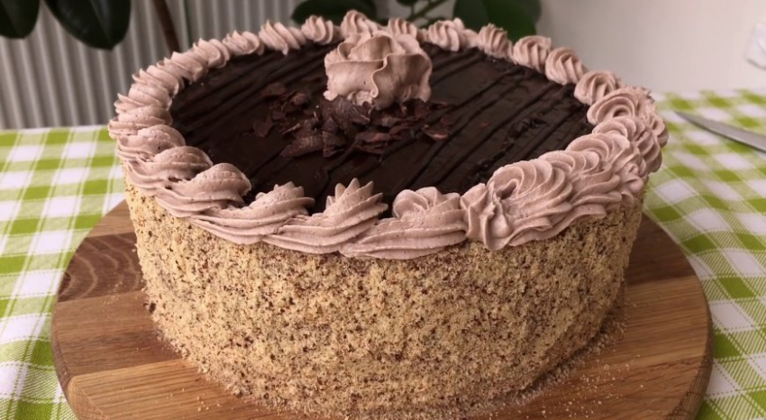 - Отправить торт «Пражский» в холодильник на 1 час, после чего бока обсыпать крошкой, захватывая немного и верх торта (как на фото).