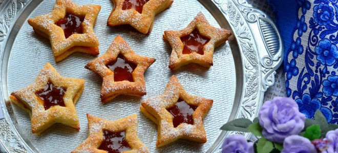 Рассыпчатое песочное печенье с вареньем — это классическое печенье из нашего детства. Традиционно его делают в виде пирога, где нижний слой — тесто, выложенное коржом, на которое выкладывают слой варенья, а сверху трут на терке охлажденные остатки теста. Варенье для такого печенья лучше брать погуще, либо добавить крахмал в него.