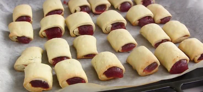 Маленькое печенье-рогалики с вареньем – хорошая идея разнообразить повседневный сладкий стол. В данном варианте лучше в тесто добавить сметану, кефир или йогурт, чтобы десерт получился более мягким, рассыпчатым. Для красоты заготовки панируют в сахаре, можно взять тростниковый, он придаст карамельного привкуса десерту.Ингредиенты: