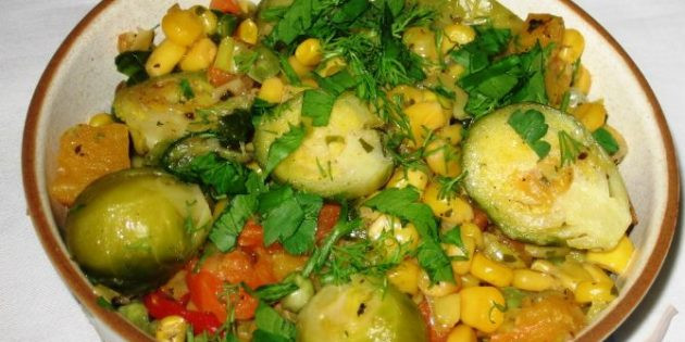 Овощное рагу с брюссельской капустой, кукурузой и тыквой